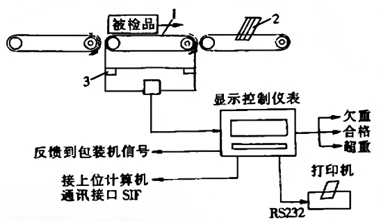 (图5 自动检重秤原理框图 1、输送机 2、别除装置 3、称量传感器)