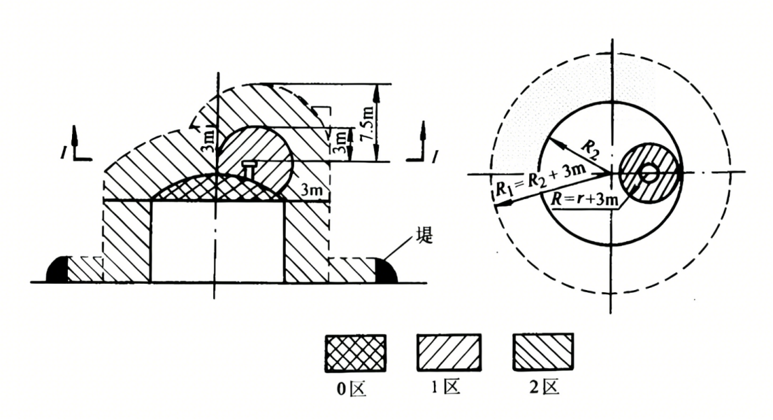 如图所示是典型的带有呼吸阀的露天油罐的危险区域划分示例